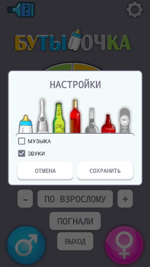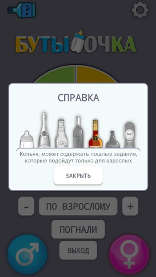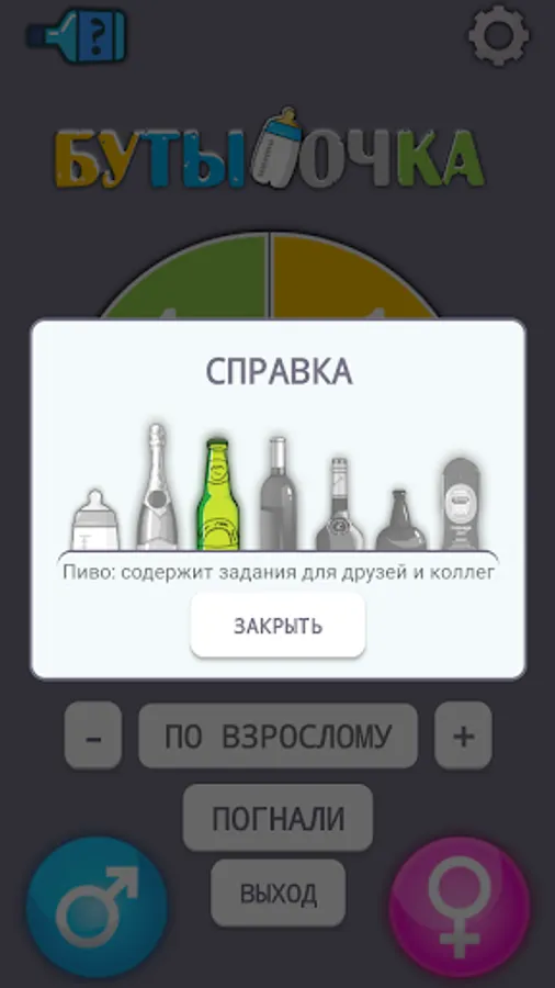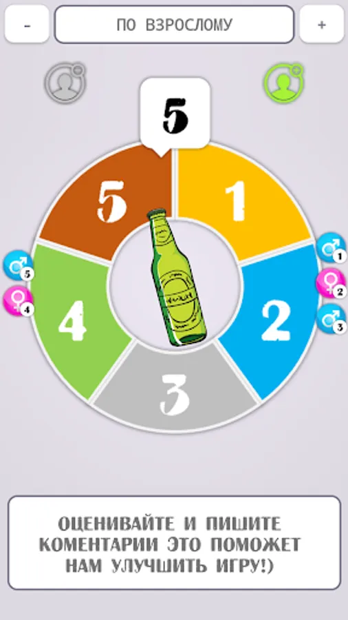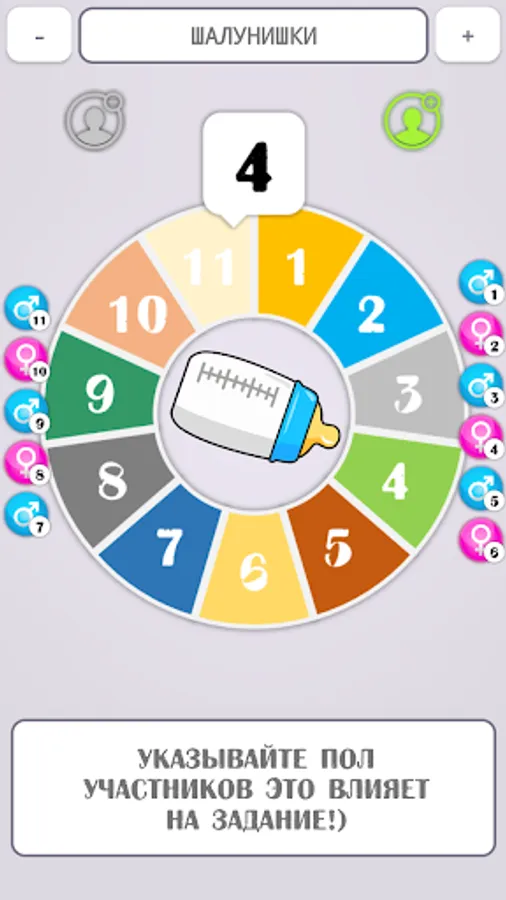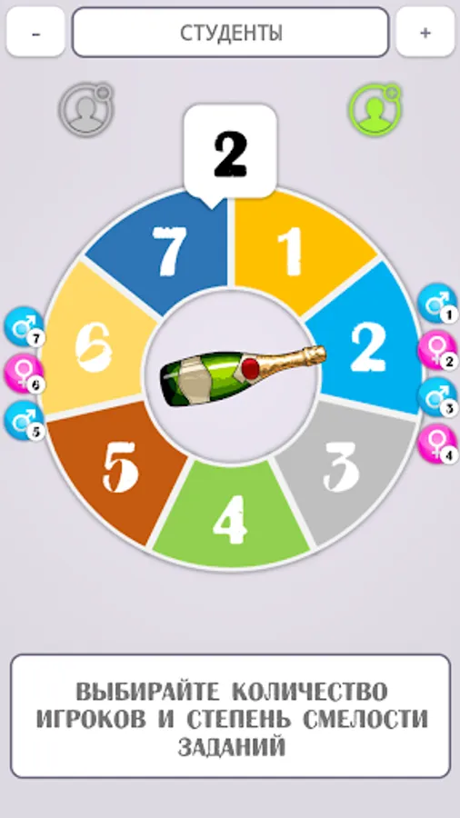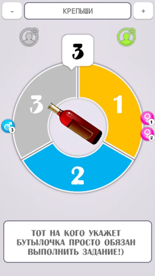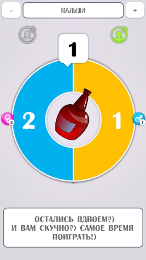 If you like "phantas" and play with a fun company😁😅😆, then you will like it here😎👍🏻. The game Bottle🍼🍾 allows you to select📥 or remove📤 bottles that contain thematic tasks📑. You can also choose the number of 1⃣5⃣ players to set their gender🚹🚺 and the level of freedom⚠🔞 tasks. Next, you just need to click on the bottle and the phone will announce the task and show the number of the participant7 who will have to complete it. Twist, complete and submit your assignments in the comments⌨💬. Good luck and happy mood!)