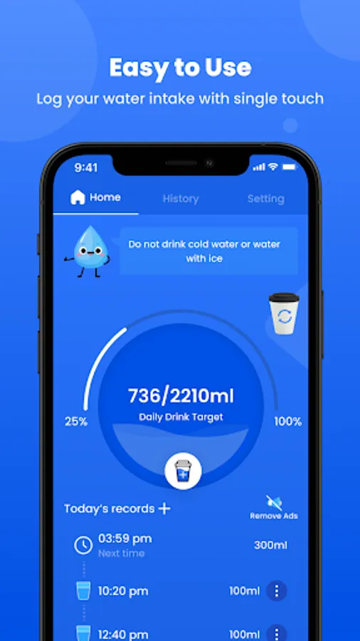 Drink water reminder offers a seamless and personalized experience, tailoring hydration goals to your unique needs. Set up your daily water intake target based on factors such as age, weight, and activity level. The water reminder app then crafts a customized hydration plan that's designed just for you, making sure you get the right amount of drink water throughout the day.