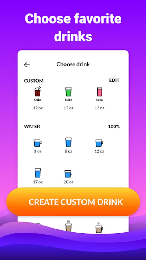 Our water app offers a collection of drinks for quick add but you can also add yours with custom icons, colors and hydration levels. Also, with this drink water reminder you can choose preferred units (ml or oz).