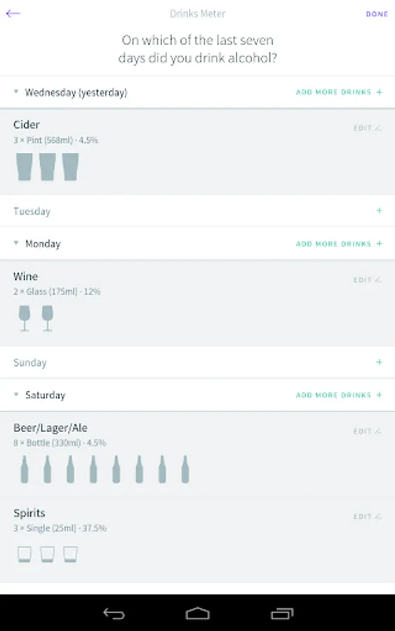• Weekly drink calculator with drink types, strengths and bottle/glass sizes from around the world