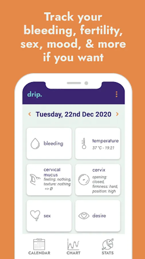 • Track your bleeding, fertility, sex, mood, pain, and more if you want