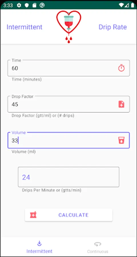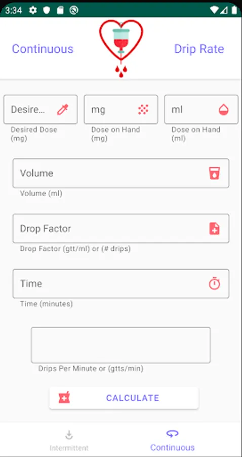 An intuitive calculator for continuous and intermittent gravity fed infusions. This app provides the ability for Nurses, Paramedics and other Healthcare Professionals to make on the fly calculations for both continuous and intermittent gravity fed infusions. Drip Drop quickly calculates the drip rate (gtts/min) so you can get back to saving lives and skip the math.