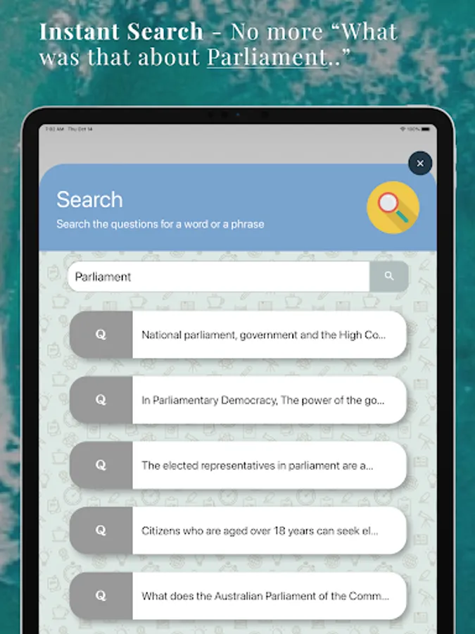 - Exclusive instant search - Type “Parliament” and get all the questions about the Parliament. No more “What was that question about...”.