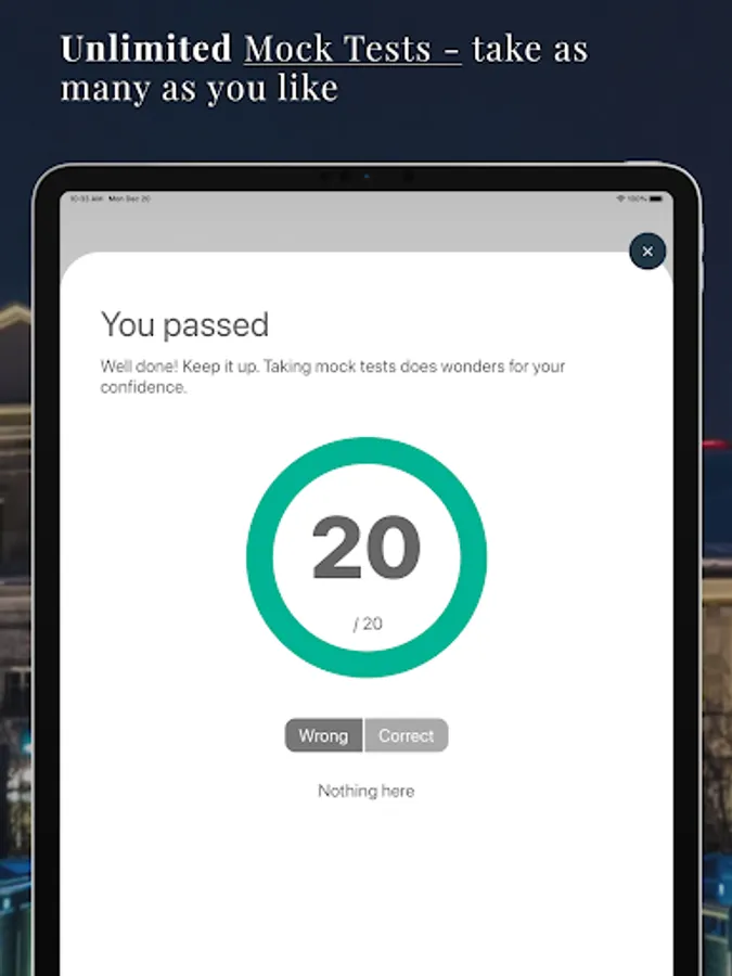 - Unlimited mock tests - Take the mock tests as many times as you like. We will track your scores. When the rings close, book the actual test!