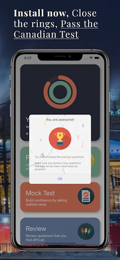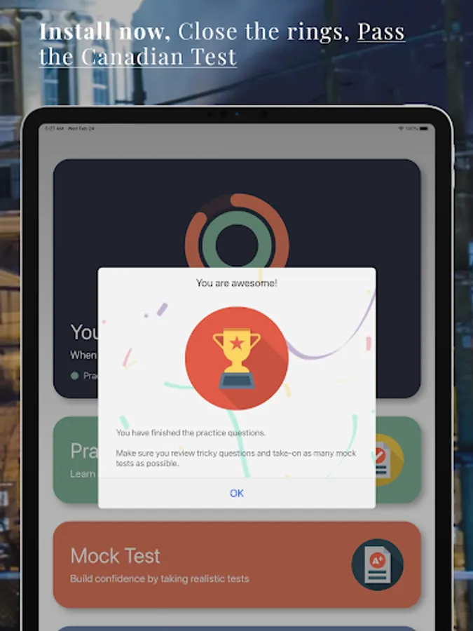 - Exclusive progress meter - Close the rings and we guarantee you will pass your Canadian Citizenship test. It is so simple - Install the app, close the rings, pass the test.