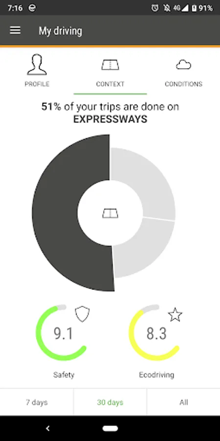 • Summary of mileage according to the road context and conditions of the rides (weather, week / weekend and day / night).