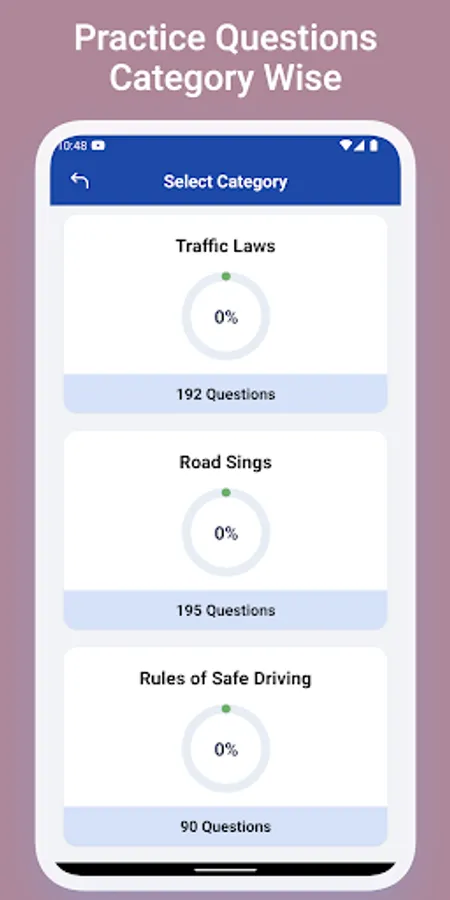 The app includes a practice module that allows to get familiar with questions that fall under different categories like Traffic Rules, Road Signs and Rules of Safe driving. It also keeps track of the progress you have made in each category. It contains questions from following categories: