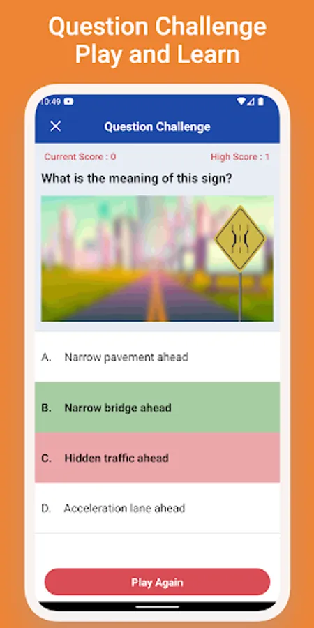 This is a unique feature of our application. It allows you learn while playing a challenge game. Your score will go up by one point each time you correctly answer a question up until the point where you get it wrong. It keeps record of your high score.