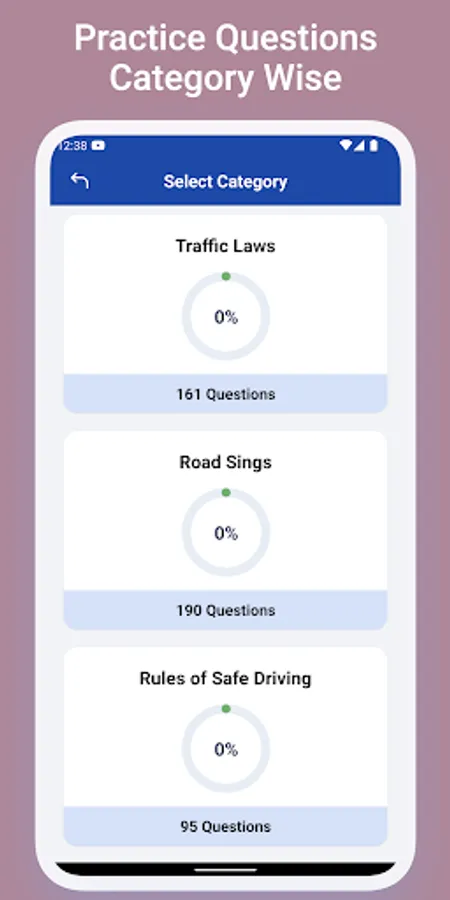 The app includes a practice module that allows to get familiar with questions that fall under different categories like Traffic Rules, Road Signs and Rules of Safe driving. It also keeps track of the progress you have made in each category. It contains questions from following categories:
