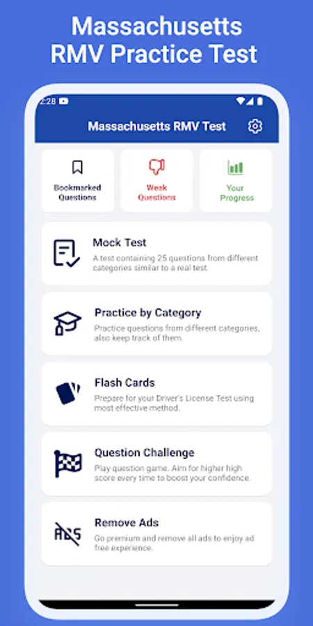 Our app provides questions based on the official manual from the Massachusetts Registry Of Motor Vehicles (RMV). The app includes driver’s permit module for the car, motorcycle and Commercial Driving License CDL. The app is a ready to use study guide material for those who want to prepare for their driver’s license test. Our app can be used to practice for the Car, Motorcycle and CDL Drive’s license.