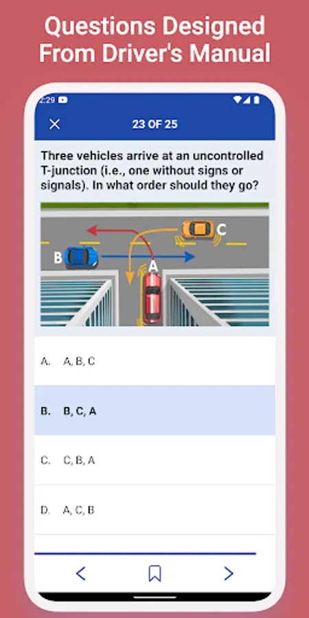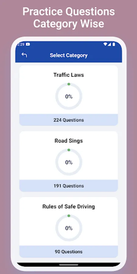 The app includes a practice module that allows to get familiar with questions that fall under different categories like Traffic Rules, Road Signs and Rules of Safe driving. It also keeps track of the progress you have made in each category. It contains questions from following categories: