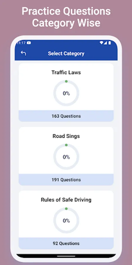 The app includes a practice module that allows to get familiar with questions that fall under different categories like Traffic Rules, Road Signs and Rules of Safe driving. It also keeps track of the progress you have made in each category. It contains questions from following categories: