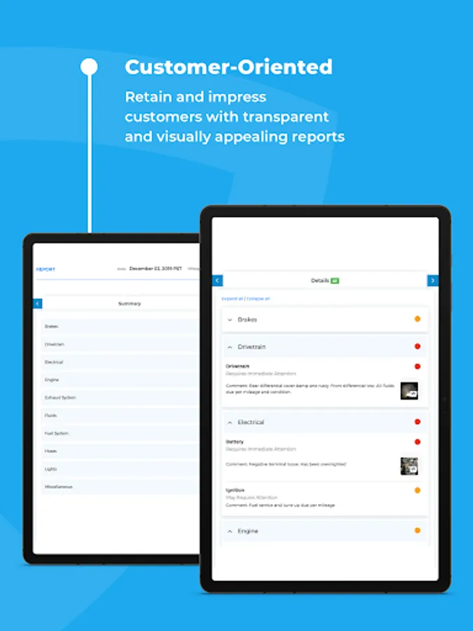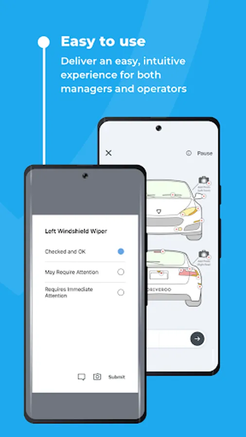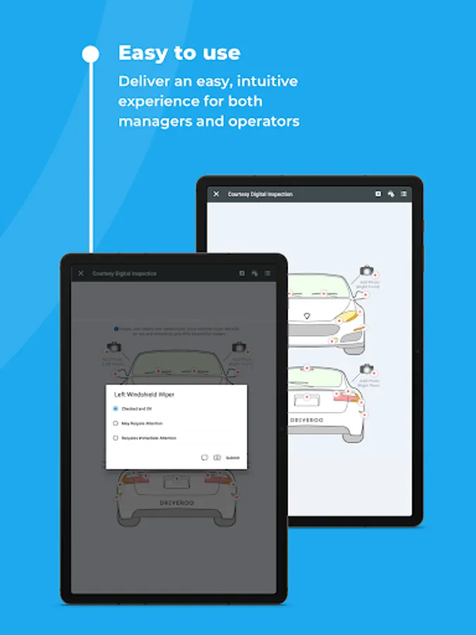 Driveroo Inspector is a powerful easy to use digital inspection software, available on any mobile phone or tablet. Driveroo Inspector streamlines the inspection process through visual input technology and presents inspection results in an easy to share comprehensive report, supported with pictures and recommendations.