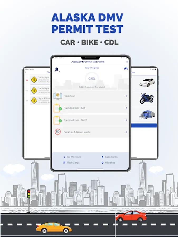 The Alaska DMV Practice test contains mock tests and practice chapter-wise questions for all three categories, like car, motorcycle, and CDL. Be fully prepared.