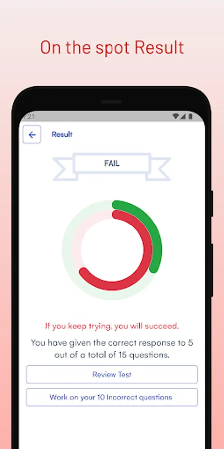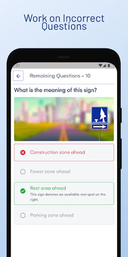 Track your score and progress on every test. You can also work on incorrect questions of specific tests. Furthermore, you can resume your previously unfinished test. You can also track your overall progress to the Instruction permit DMV exam.