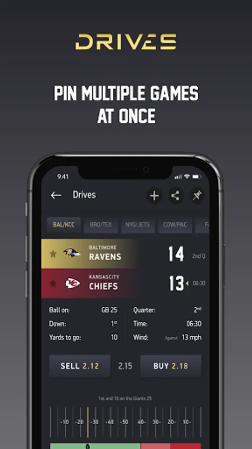 Drives Football is the world’s first in-game app that lets users buy or sell the outcome of each offensive play or possession. It is a social game where players compete against the computer, friends or in open Contests and Leagues.