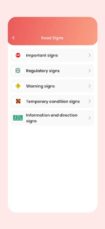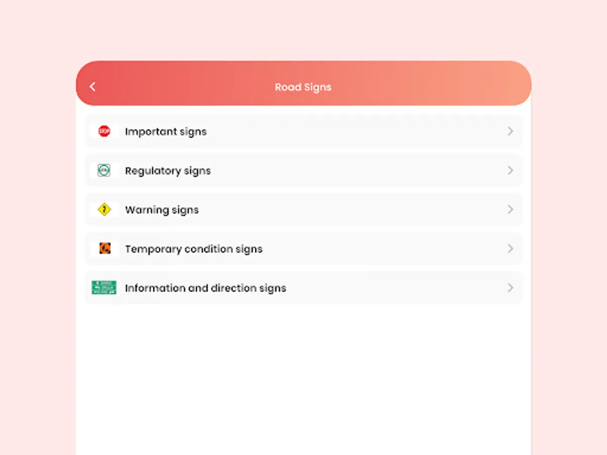 3. Road Signs – a full list of all relevant road signs, by categories.