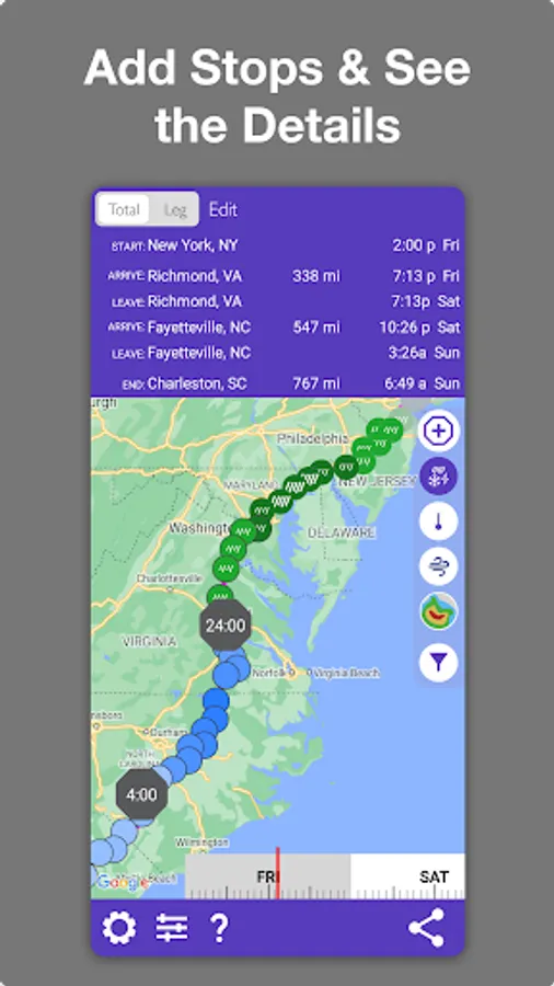 Drive Weather illustrates the National Weather Service's weather forecast showing drivers the weather along their route at the time they reach each point. It allows comparison of different routes, creating stops, interactively changing departure time, and other features that help plan trips around the weather.