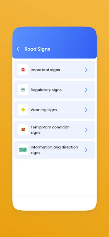 3. Road Signs – a full list of all relevant road signs, by categories.