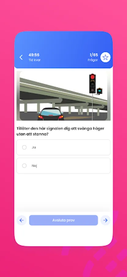 Our app offers you the option to take the test with a countdown timer, which simulates a real test. By using the countdown timer, you practice for the Swedish Transport Administration's real theory test, so that you can easily get your driver's license.