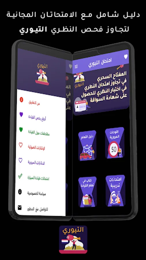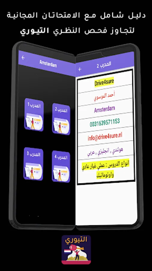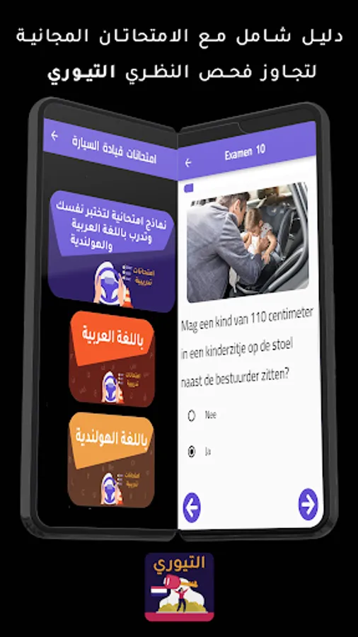 First: Renewable training exams, which include more than 1,000 questions, divided into multiple tests in Arabic and Dutch to help the user understand and memorize the theoretical driving curriculum with ease.