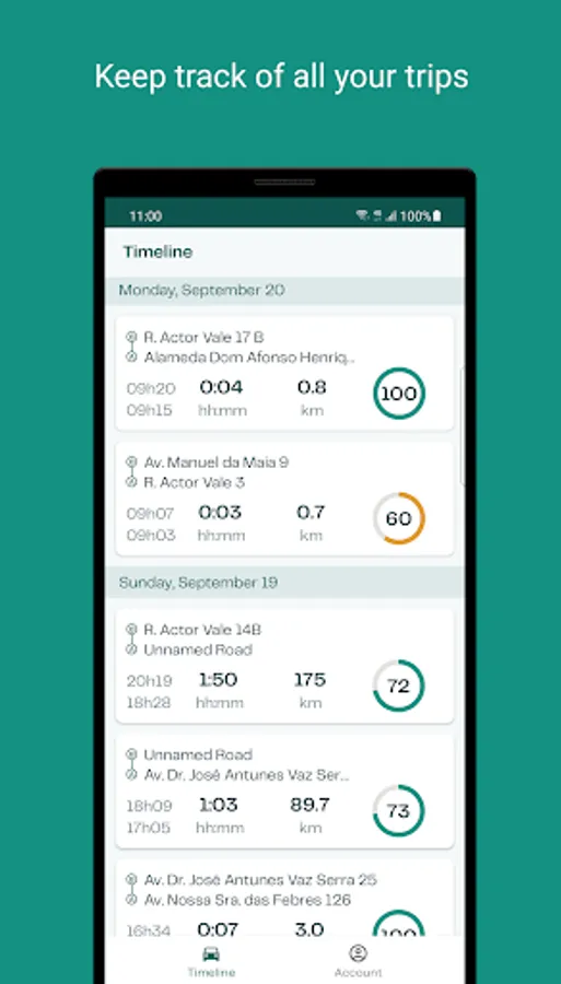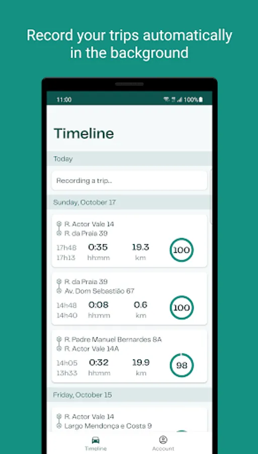 • Automatic trip recording: Drivit records your trips automatically without requiring your interaction. You can then see them on our trip timeline along with origins, destinations, distances, and driving scores