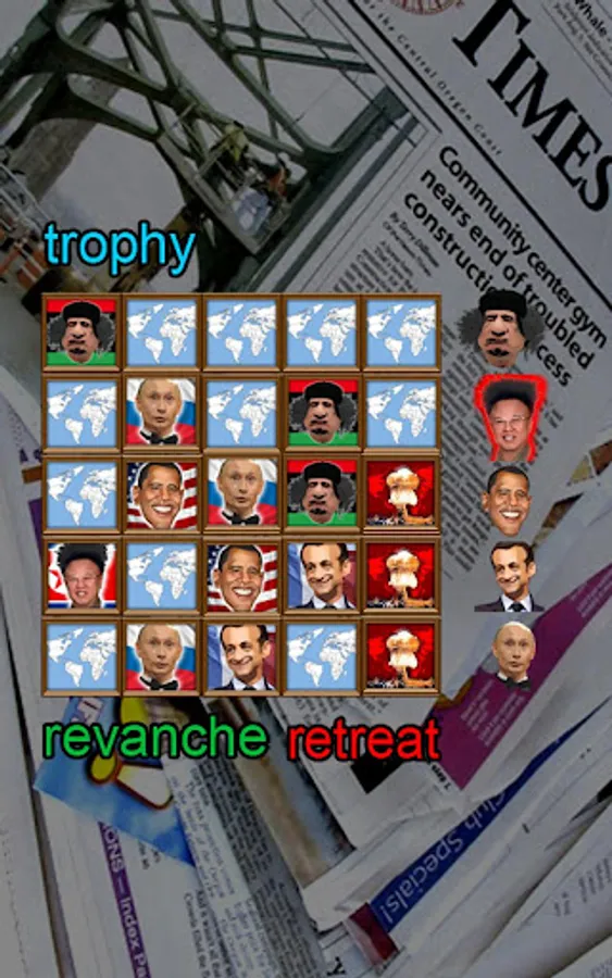 GaddafiGame is a political joke game. It’s a sort of TicTacTouch game with slightly more complicated rules. You manipulate with 5 different portraits of the popular politicians. If you’re able to place 3 or more portraits of the politicians in a horizontal, vertical, or diagonal row then the portraits disappear and you get 10 points for each disappeared portrait. After each player’s step, computer places 1-5 different politicians’ portraits somewhere in the grid. The goal of the game is to get the highest score.