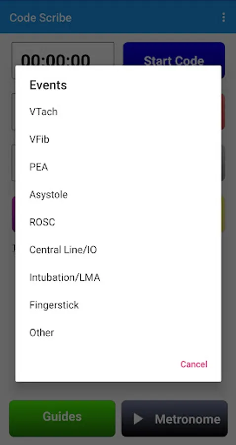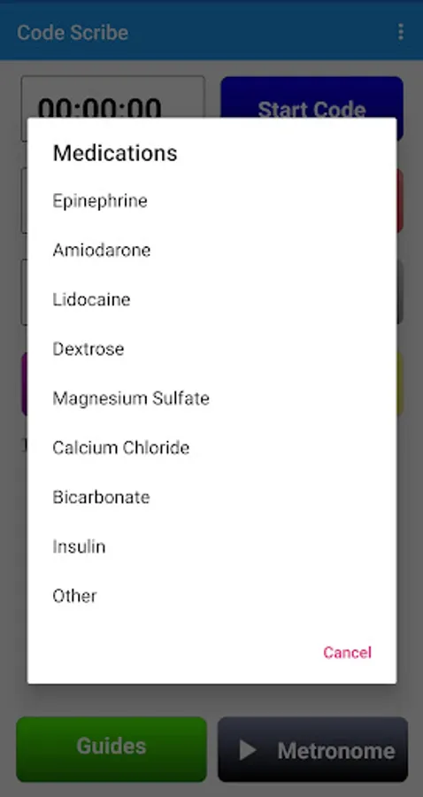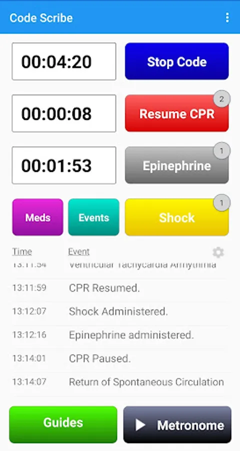 An app designed to help run a code blue as a team leader or as a logger. Timers display time between CPR cycles and medications. Log times of medication administered and other events during a code. Use this app to help manage and document codes more effectively.
