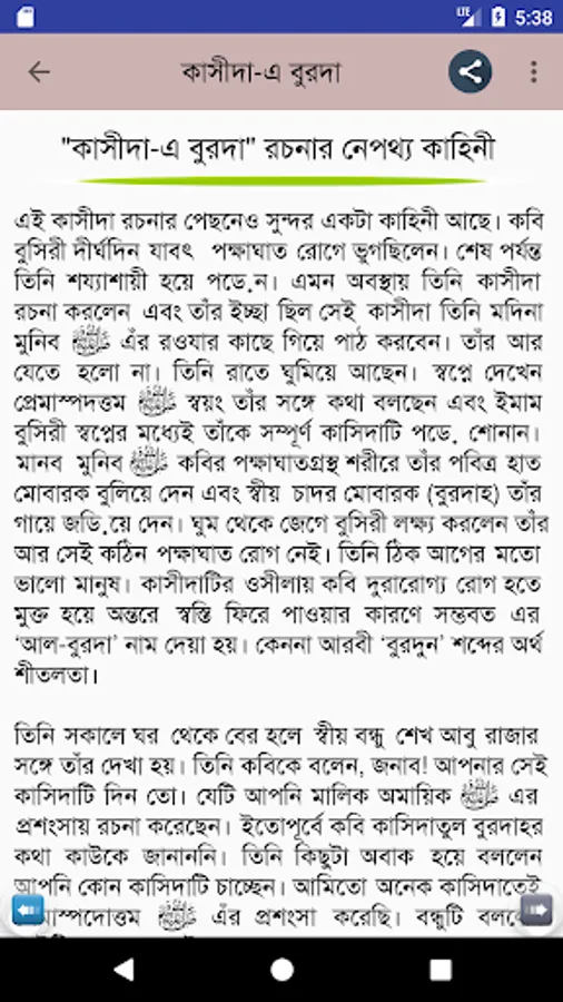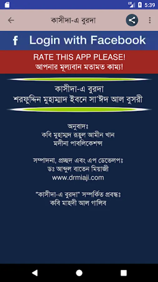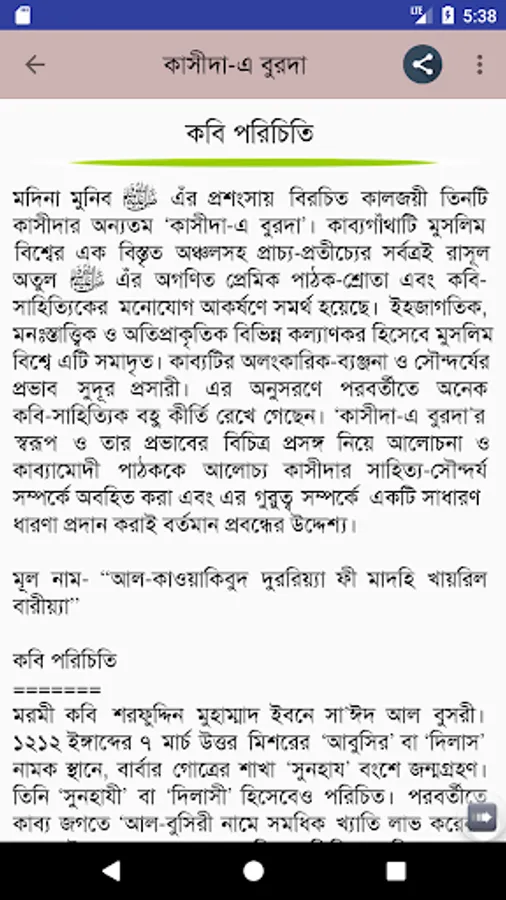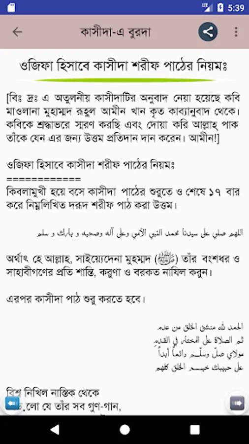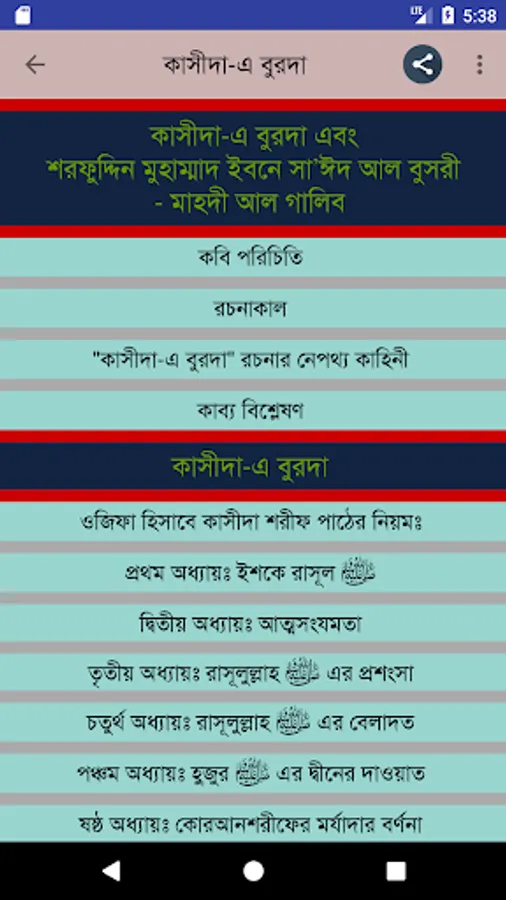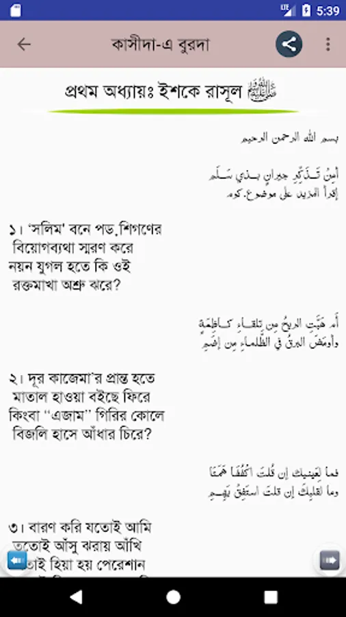 This app contains complete Arabic verses of Qaseeda Burda Shareef and Bengali poetic translation of Qasida-e-Burdah by poet Mohammad Ruhul Ameen Khan.