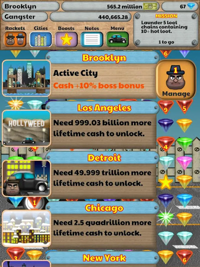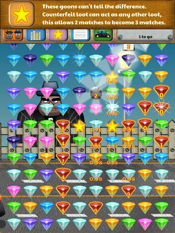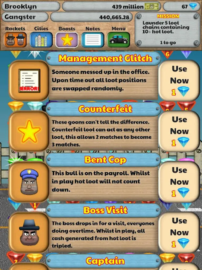 • Launder loot for the mob using Match-3 generating large amounts of cash and respect
