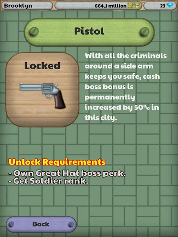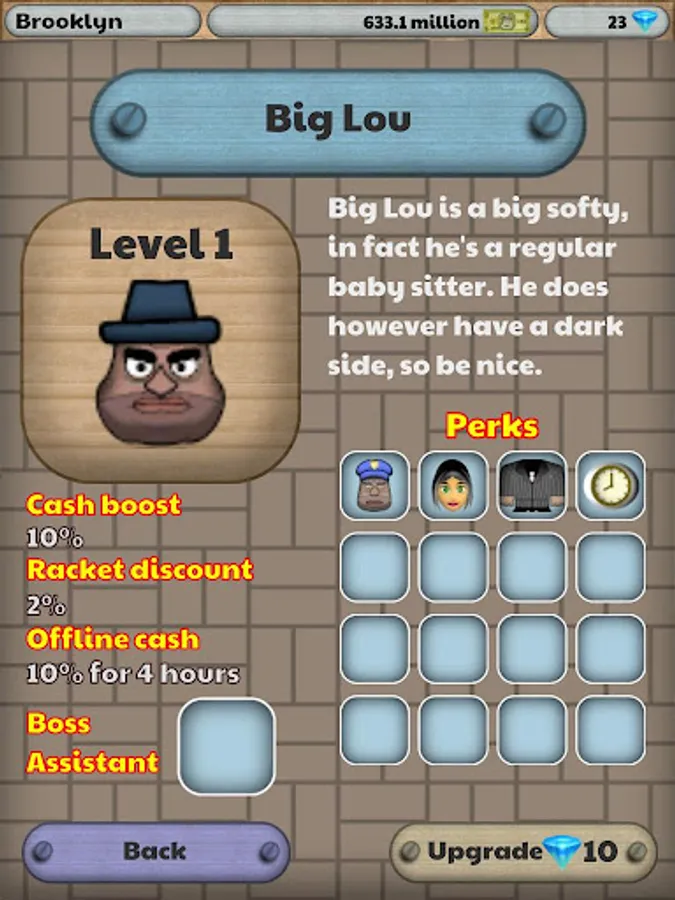 • Hire upgradeable city bosses to increase money flow, reduce racket costs, generate dosh offline