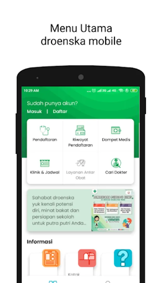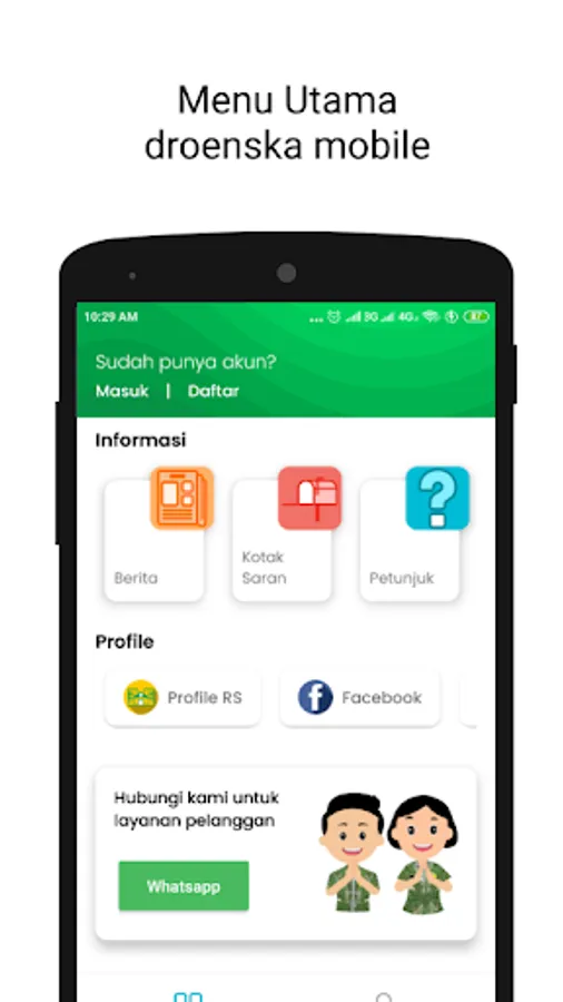 RUMAH SAKIT Dr. OEN KANDANG SAPI SOLO terus berkembang seiring kepercayaan warga Surakarta dan sekitarnya yang telah memilih kami sebagai penyedia layanan kesehatan. Untuk tetap dapat memberikan pelayanan yang terbaik, maka kami menghadirkan inovasi baru droenska mobile. Fitur utamanya akan memberi kemudahan bagi Anda dalam melakukan pendaftaran sesuai dengan jadwal Dokter yang sudah Anda pilih.