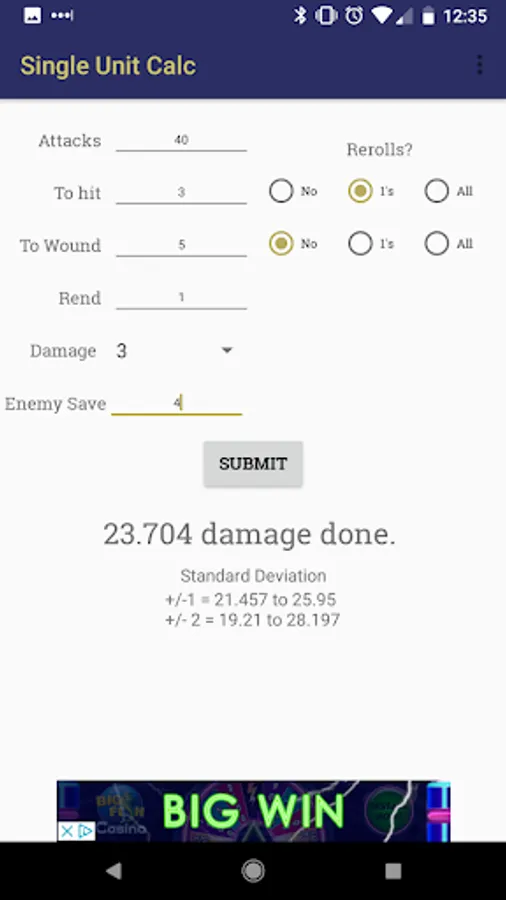 A theory crafting app for Warhammer Age of Sigmar. Enter unit stats and the app will calculate the average damage for that unit. Great for theorycrafting or for trying to decide between those two offensive units you love but can only take one of!
