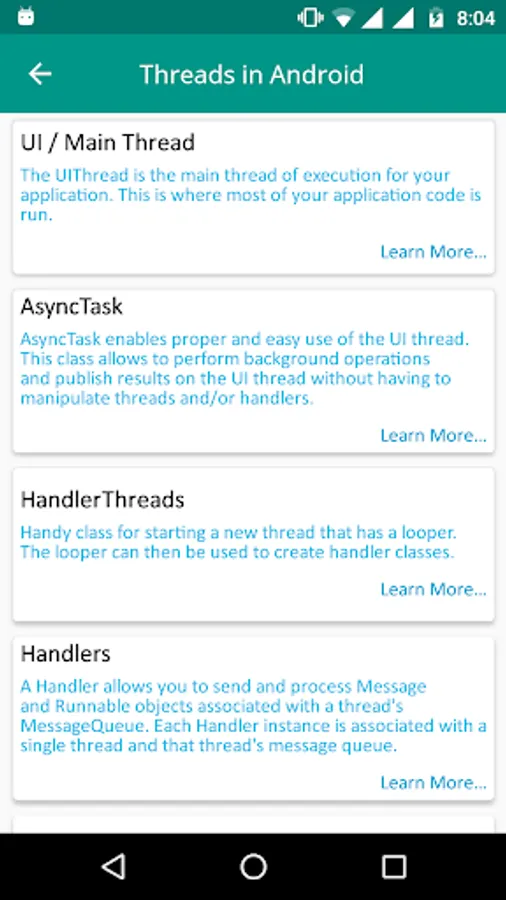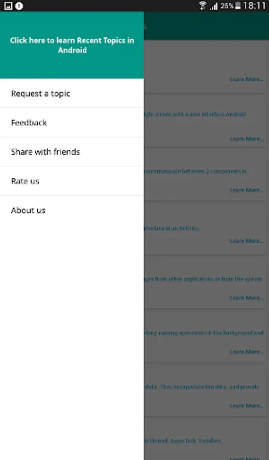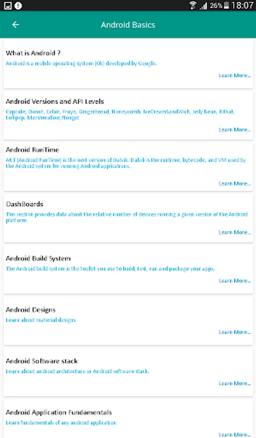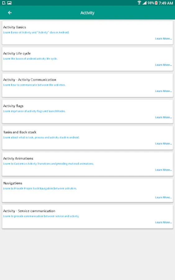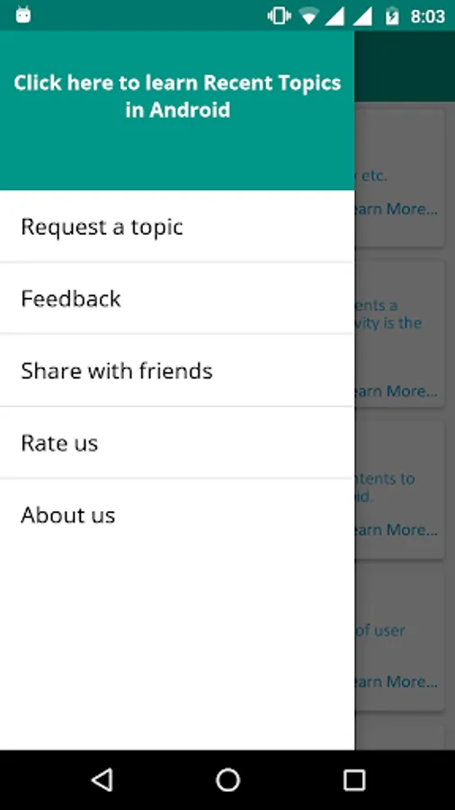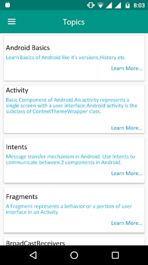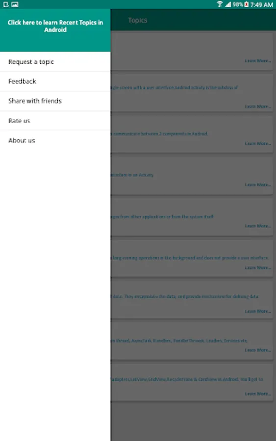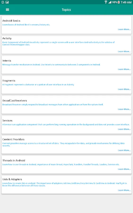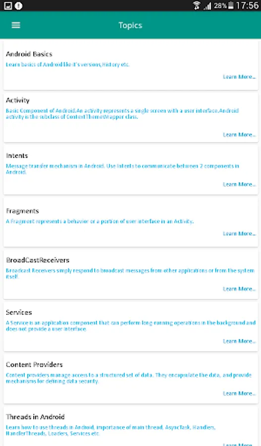 Learn Android is based on Android Learning on mobile devices. You can Learn right here for FREE of cost. This application allows you to learn everything necessary about Android Application Development. No need to go for any android training courses from any institution by paying a ton of money. If you want to prepare for Android interview then in this application you'll get lots of references to commonly asked android interview questions. This application will provide you in depth knowledge of each topics inside android. Also separate tab is added to find out recent topics in Android.