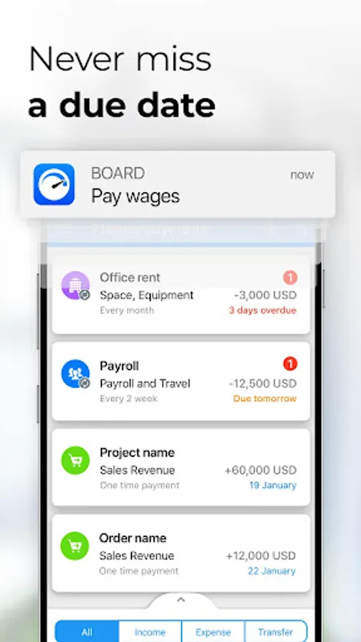 Board is a fitness tracker for your business. See all your cash flow in one place, and be prepared for whatever comes next. Never be surprised by unexpected expenses. Use your time wisely, and don't waste it chasing numbers: automatic bank synchronization and categorization keeps you up to date at all times. Growing your business means having the numbers you need to move forward. Get financially fit with Board.