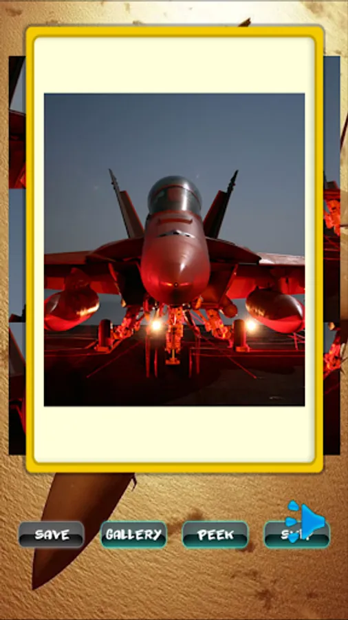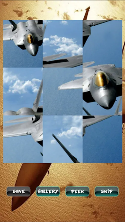 Enjoy of high quality images. The game contains 60 levels with beautiful aircrafts pictures. Drag the pieces to the right place to create the image. Use "Peek" button to preview the original image. Completed levels will be unlocked and you can save images to SD-card. If you can not complete any level you can simple skip it and try to complete it later. Just press "Skip" level button to skip current level.