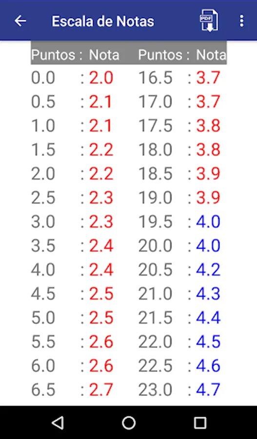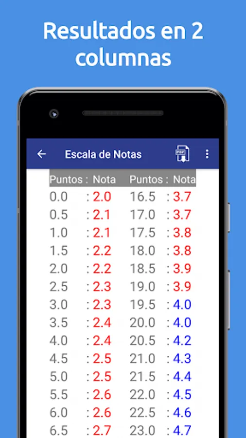 The results are shown in two columns, differentiating in red and blue, the notes that are below and above the approval score, respectively.