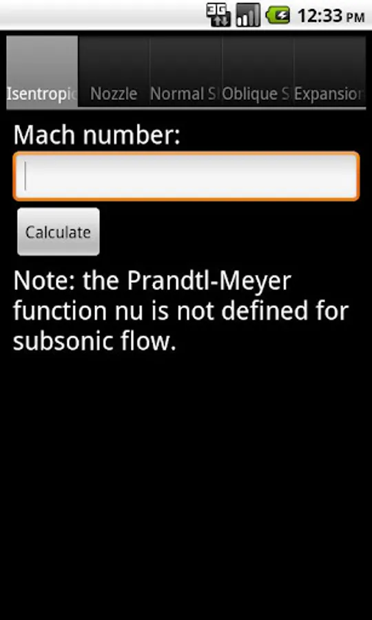 1) The isentropic tab now contains the 'nozzle solve' option in terms of A/A*, and additional buttons have been added to allow to solve for all properties as a function of either M (as before), P0/P, Rho0/Rho, T0/T or A/A*. Whichever you want, just input the value and then hit the appropriate button. Stagnation ratios must be >1 (a value <1 would be nonsensical).