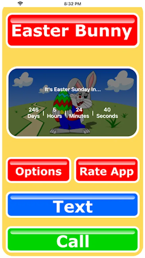 *Watch a video advertisement OR make an in-app purchase to enable text message Easter Bunny feature which also removes the adverts forever (internet connection required).