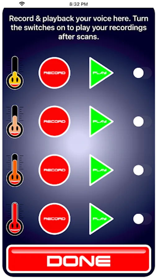 - Press 3 dots menu button (top right of scanning screen) and select 'Record your voice'. Here you can record and playback voice recordings of up to 10 seconds for each of the 4 Hot O Meter game results. The game will change the pitch of your voice to sound like the Hot O Meter. After you have recorded turn the switches ON to use your recording instead of the Hot O Meters when he speaks the scan result. This means you can customise your scans to have fun with your friends. Example recording if your name/friends name is Kim: "Hey baby, Hot O Meter says Kim is hot!".