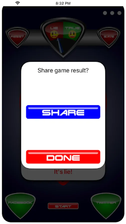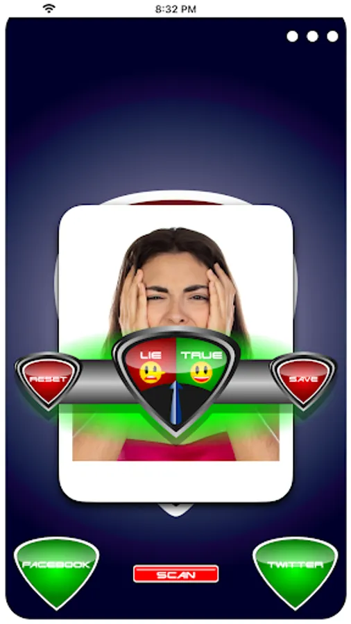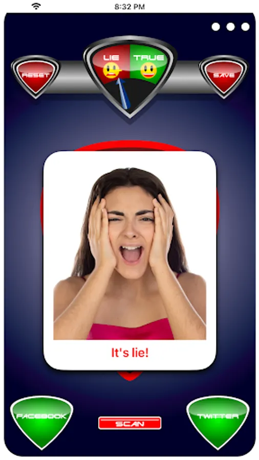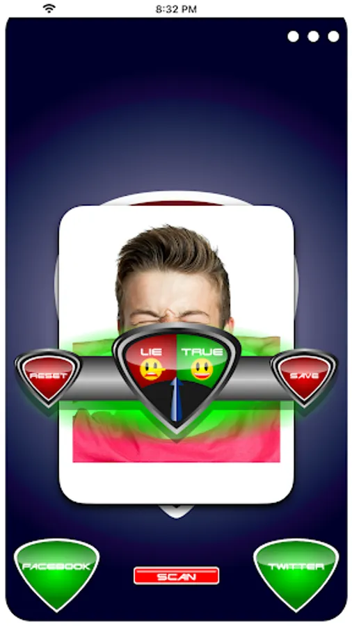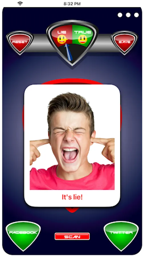 - Press start and Lie Detector Face Test Prank scans over your photo then selects a random or user selected result either true or lie!