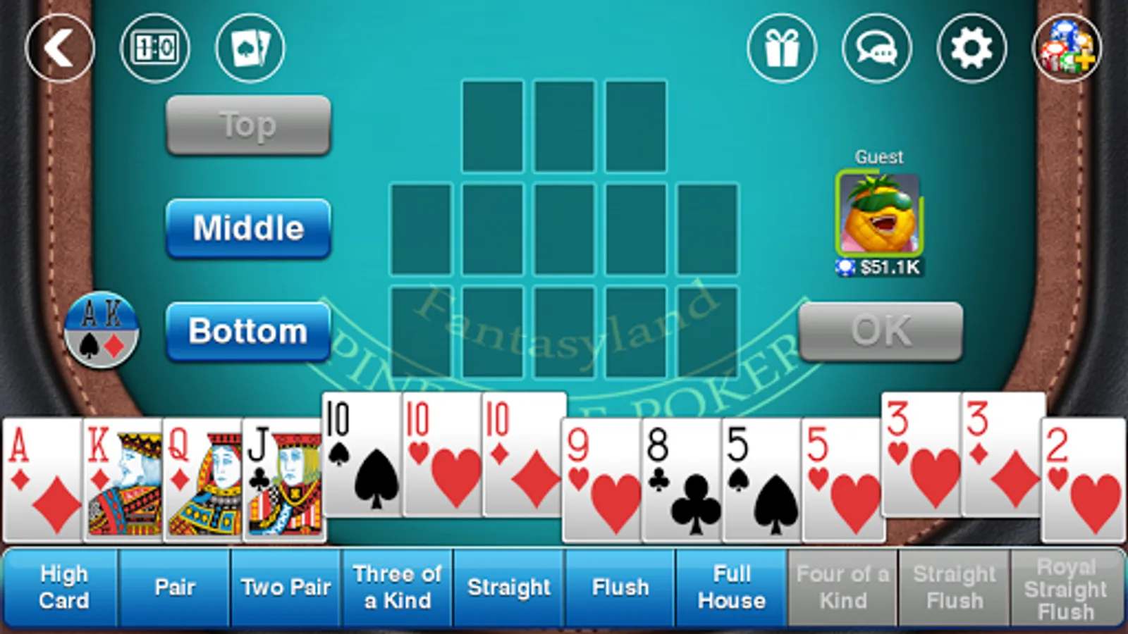 # In the Fantasyland, the player receives all 14 cards at once in the beginning. The Player has to select 13 cards and discard 1 card to set a hand. When all players finish, they show their hands and compare with other players. If you have a Three of A Kind in top or at least a Four of A Kind in bottom, you will enter Fantasyland again.