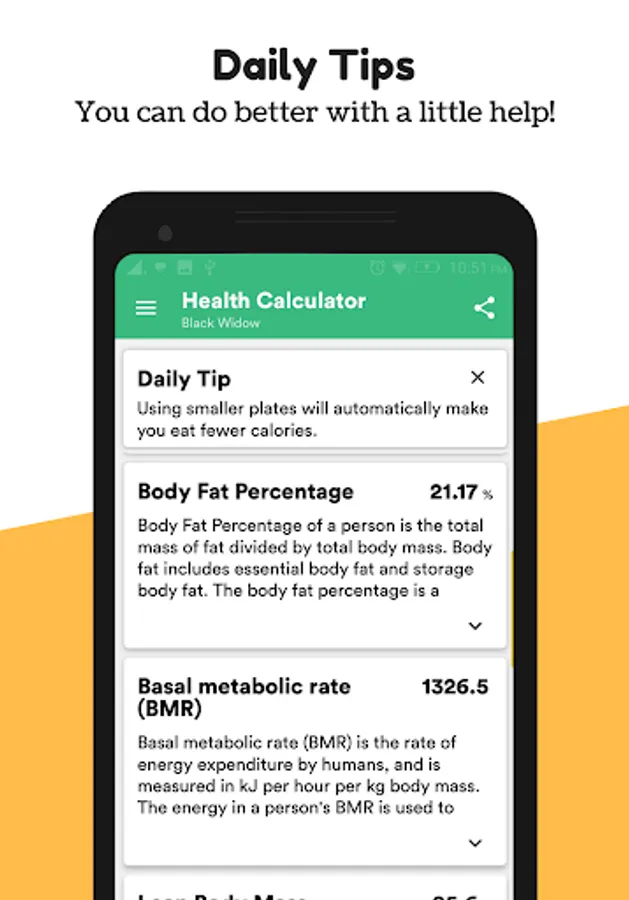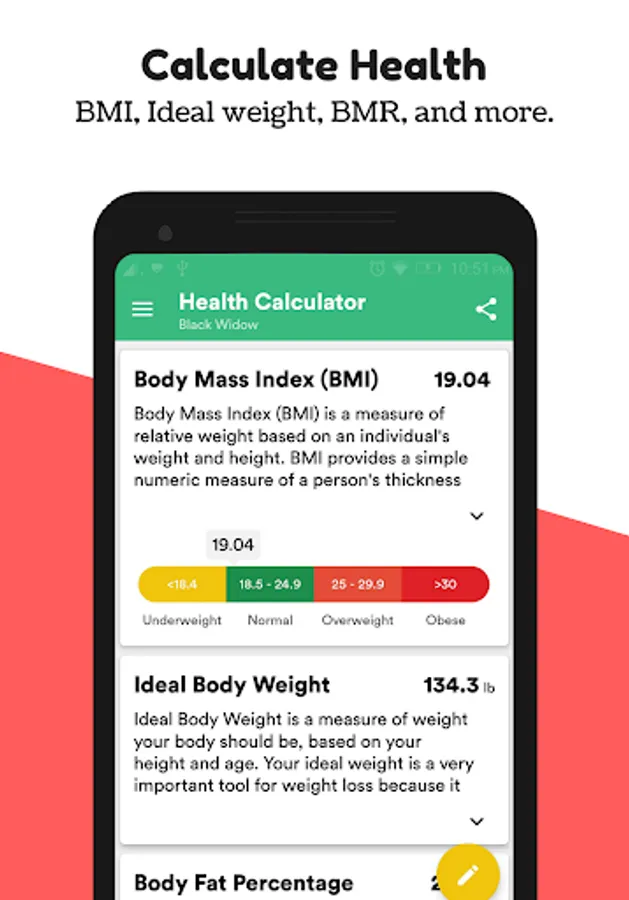 ★ Calculate Body mass index (BMI), Ideal weight, Metabolic rate (BMR), Water intake, etc., in a single click.