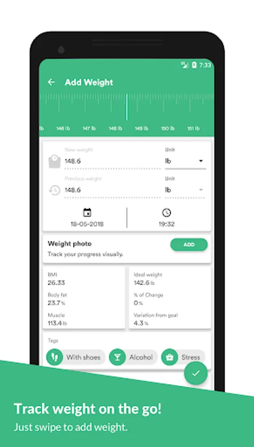 ✓ Track your weight on the go. Just swipe to add weight.
