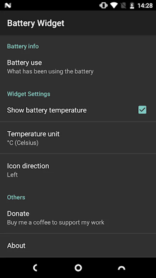 A lightweight & simple widget to show you battery level and temperature. You can tap the widget to get more battery info.