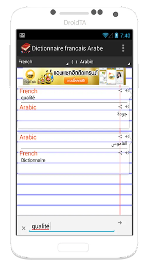 This dictionary application is easy to use. You may know the translation between French and Arabic.