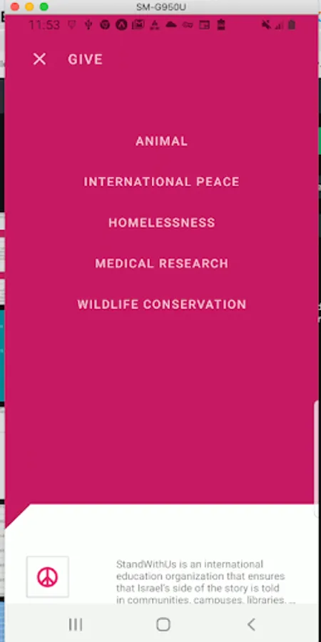 5 causes from the CharityNavigator API are presented in a backdrop menu implementation: