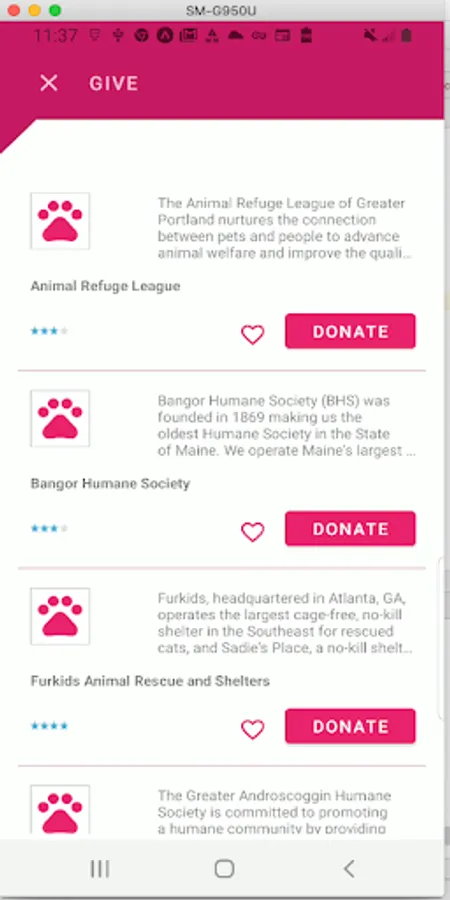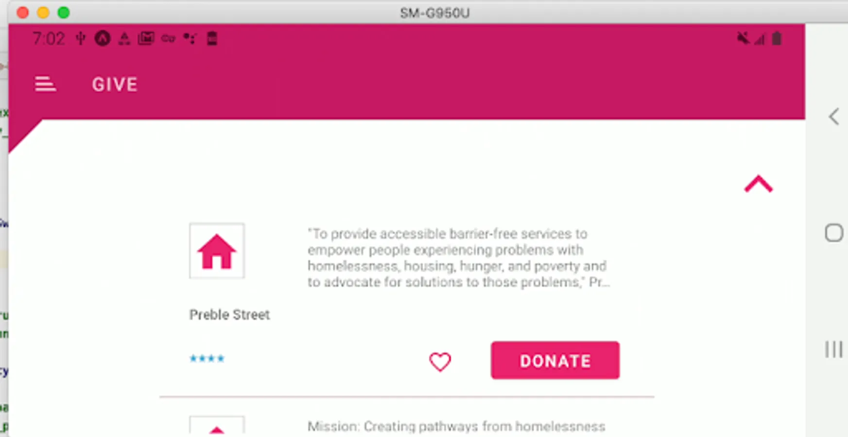 The user can choose a cause and see a list of rated charities. A master-detail, favorites action, and donation capability are forthcoming in the next release.