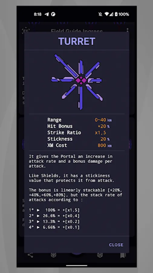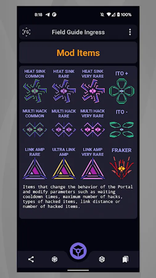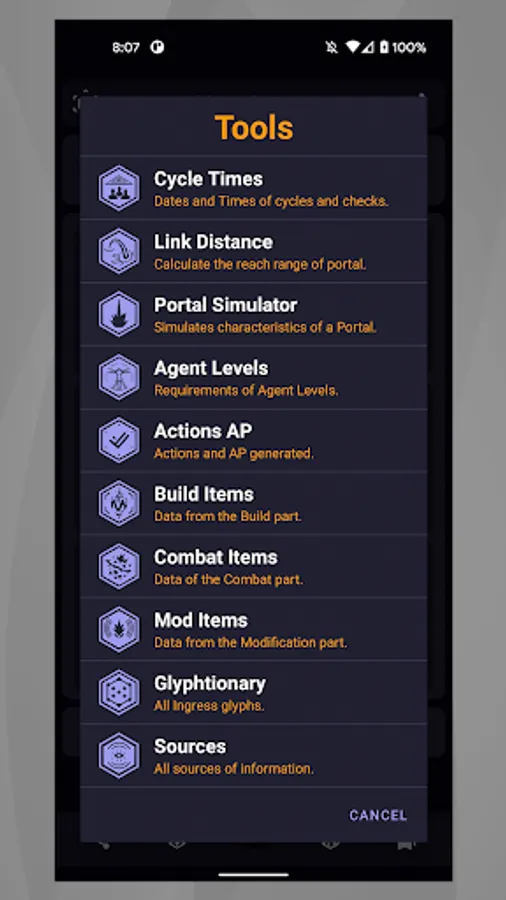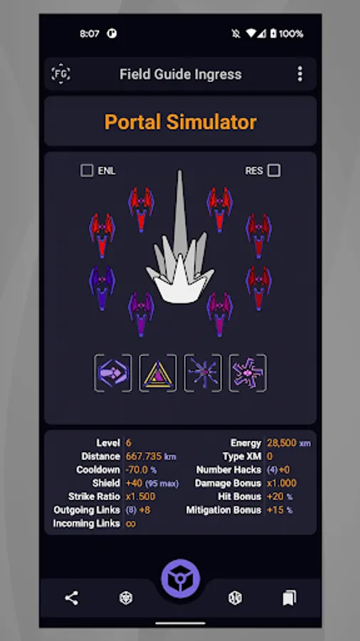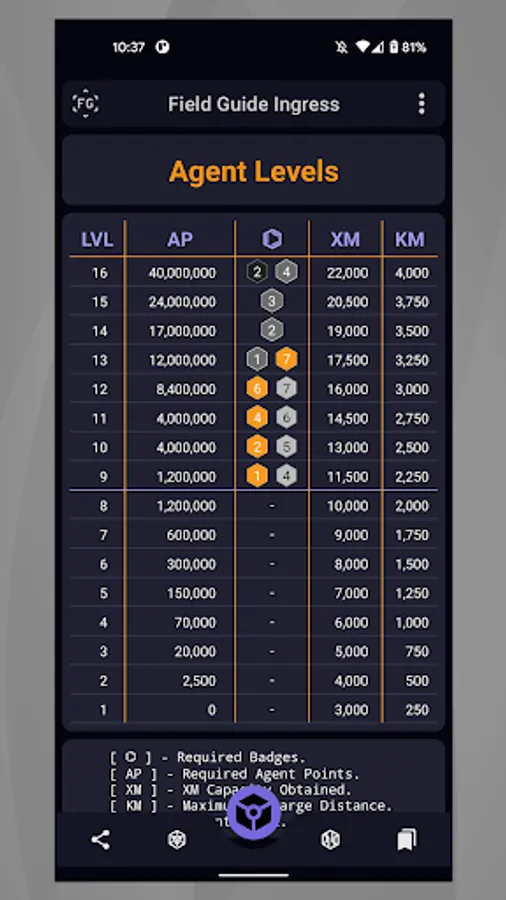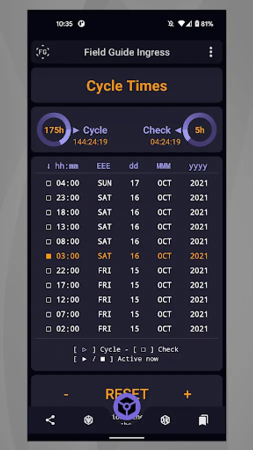 Field Guide for INGRESS game. Where you can check the times of Cycles, Checks, Link Distances, Access Levels, Items....