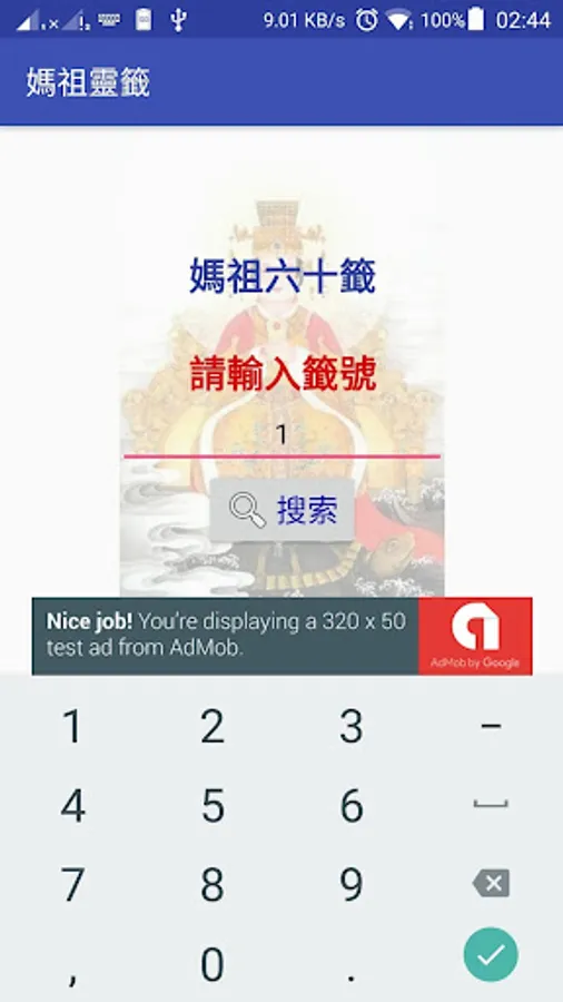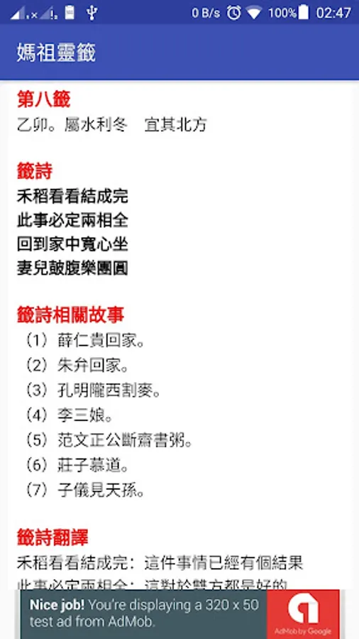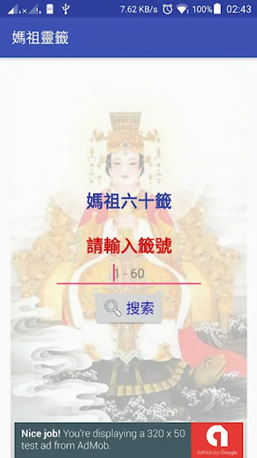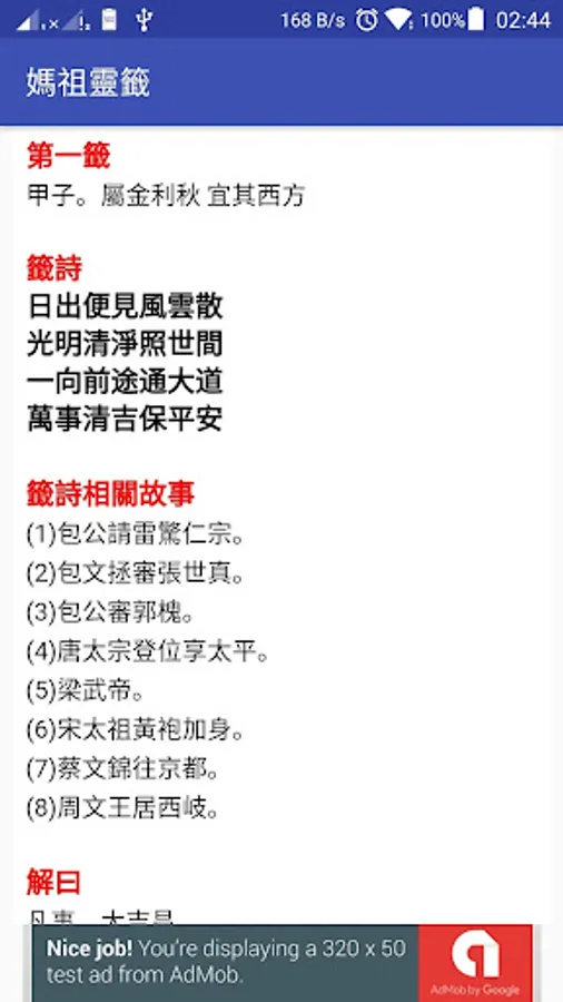 本軟件是根據媽祖六十籤所設計的,內有籤文的解說。